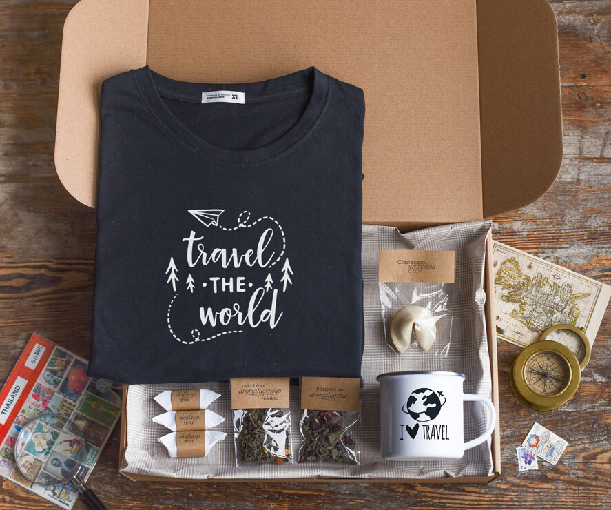 Top męski, koszulka dla miłośników wyjazdów w dalekie podróże. T-shirt z motywem podróżniczym w pudełku prezentowym z dodatkami.