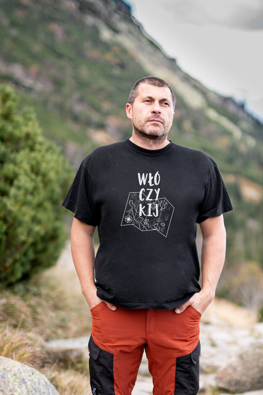 Piękna dzianinowa Bawełniana Koszulka męska w klasycznej czerni z motywem podróżniczym - idealnie nadaje się na prezent dla miłośników wycieczek w nieznane.