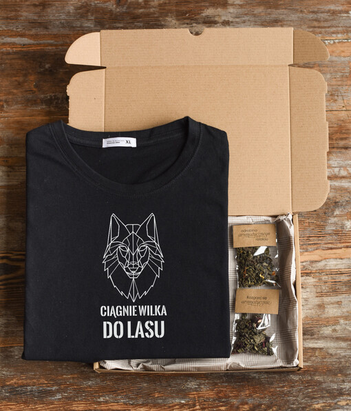 Pudełko prezentowe z czarną koszulką męską T-shirt. Koszulka z nadrukiem - ciągnie wilka do lasu - prezent dla niego