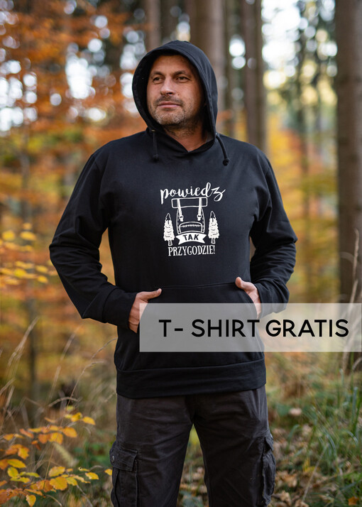 Płatności: Przelew, Karta, Blik, PayU, Przelewy24Pudełko prezentowe z czarną koszulką męską T-shirt oraz dodatkami. Koszulka T-shirt czarna z nadrukiem - chodźmy spać w lesie