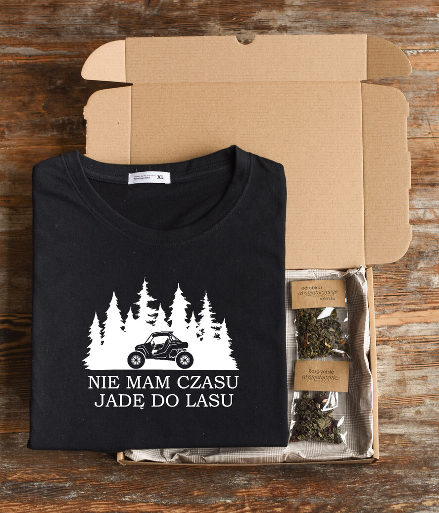 Pudełko prezentowe z czarną koszulką męską T-shirt oraz dodatkami. Koszulka T-shirt czarna z nadrukiem - nie mam czasu jadę do lasu
