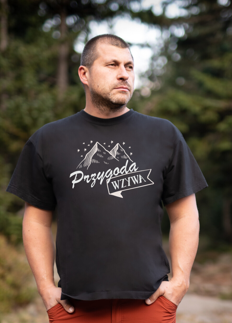 czarna męska koszulka z nadrukiem - Przygoda wzywa - Pudełko prezentowe z czarną koszulką męską